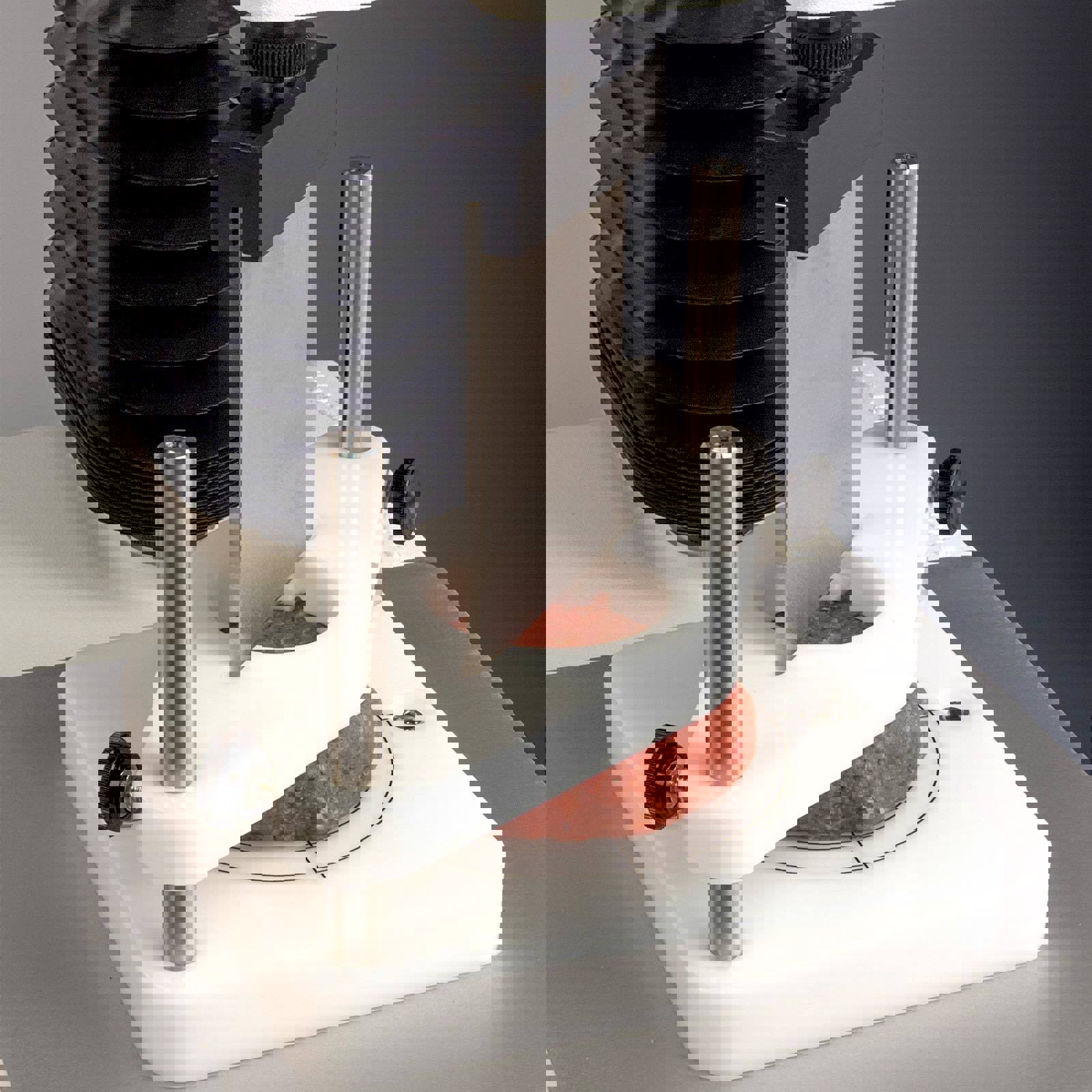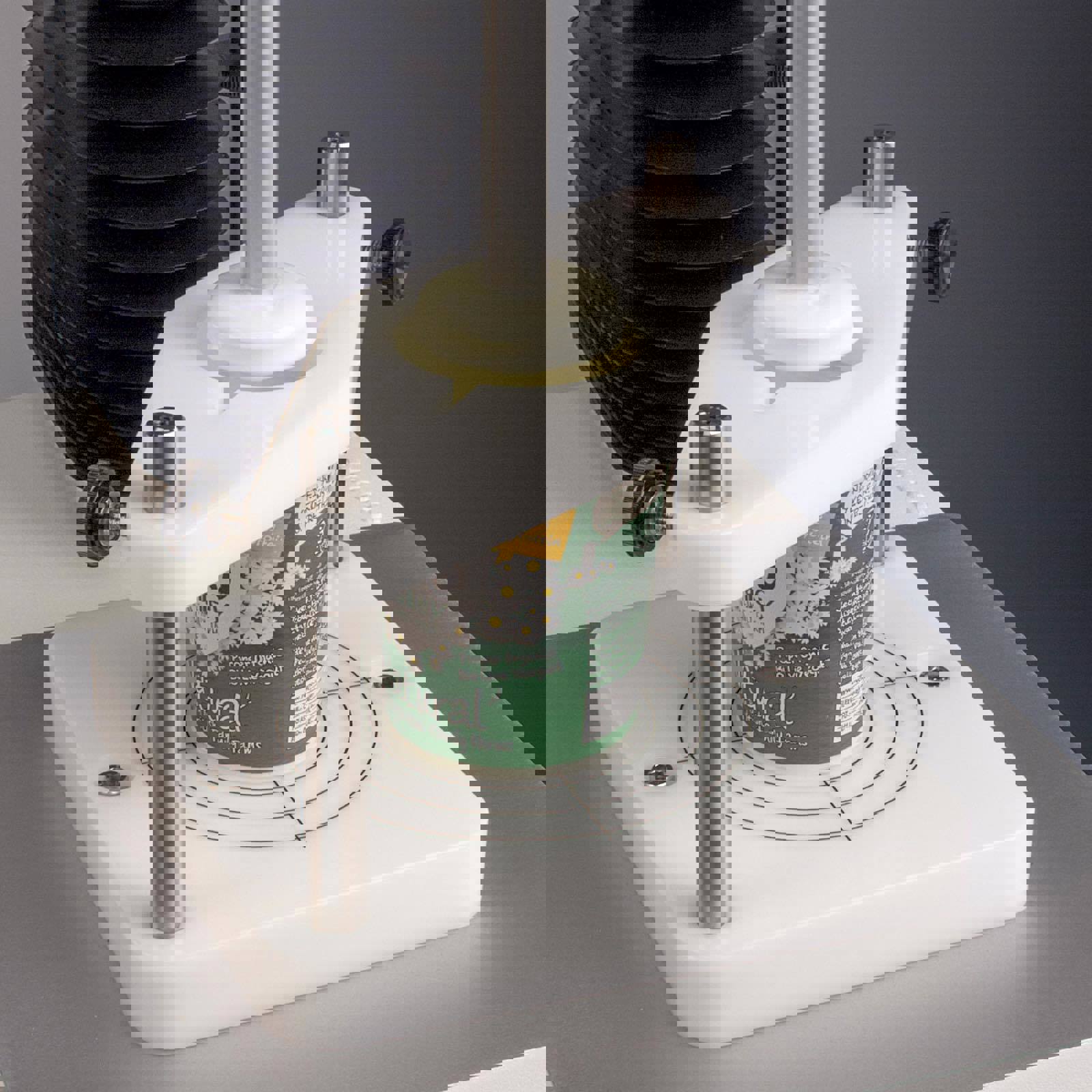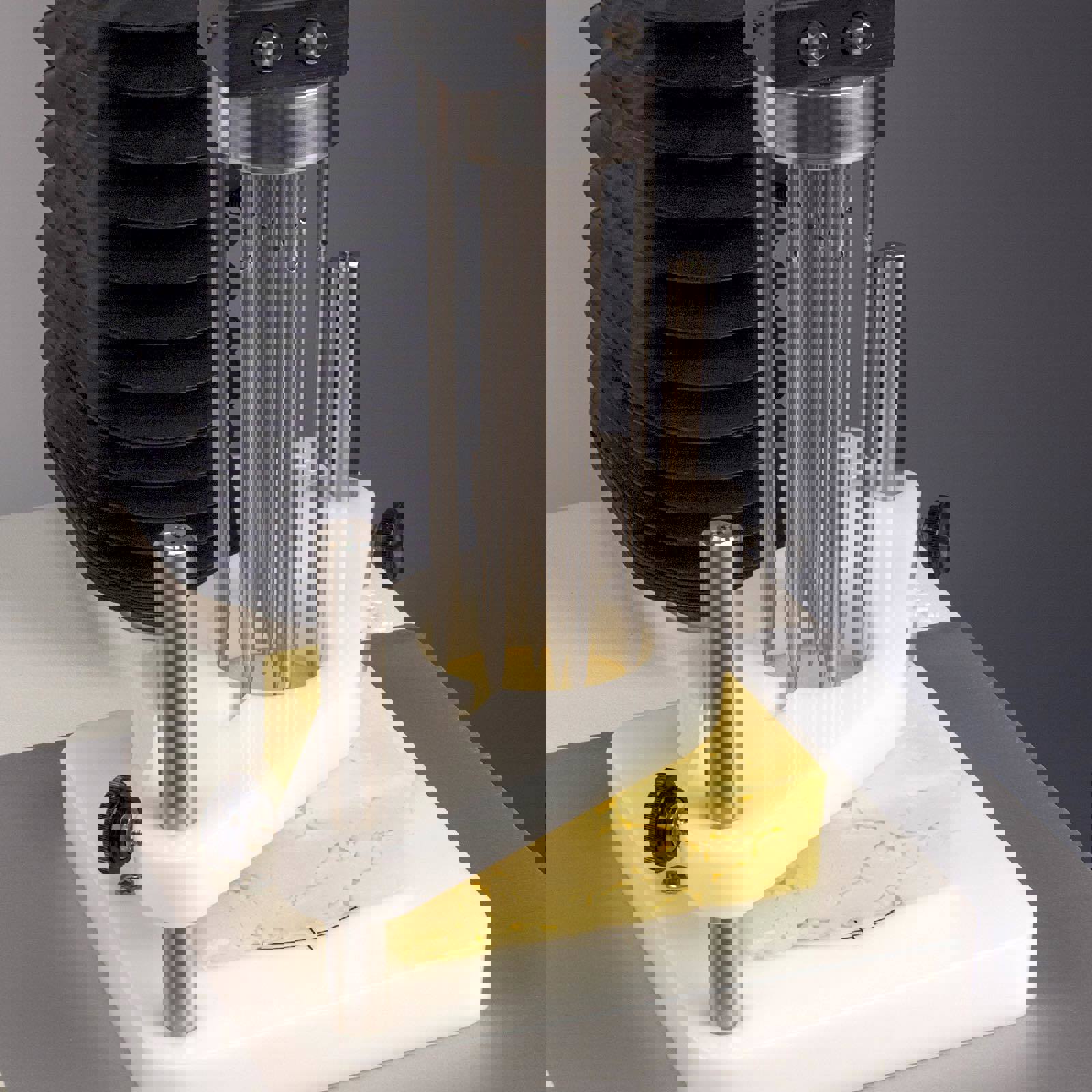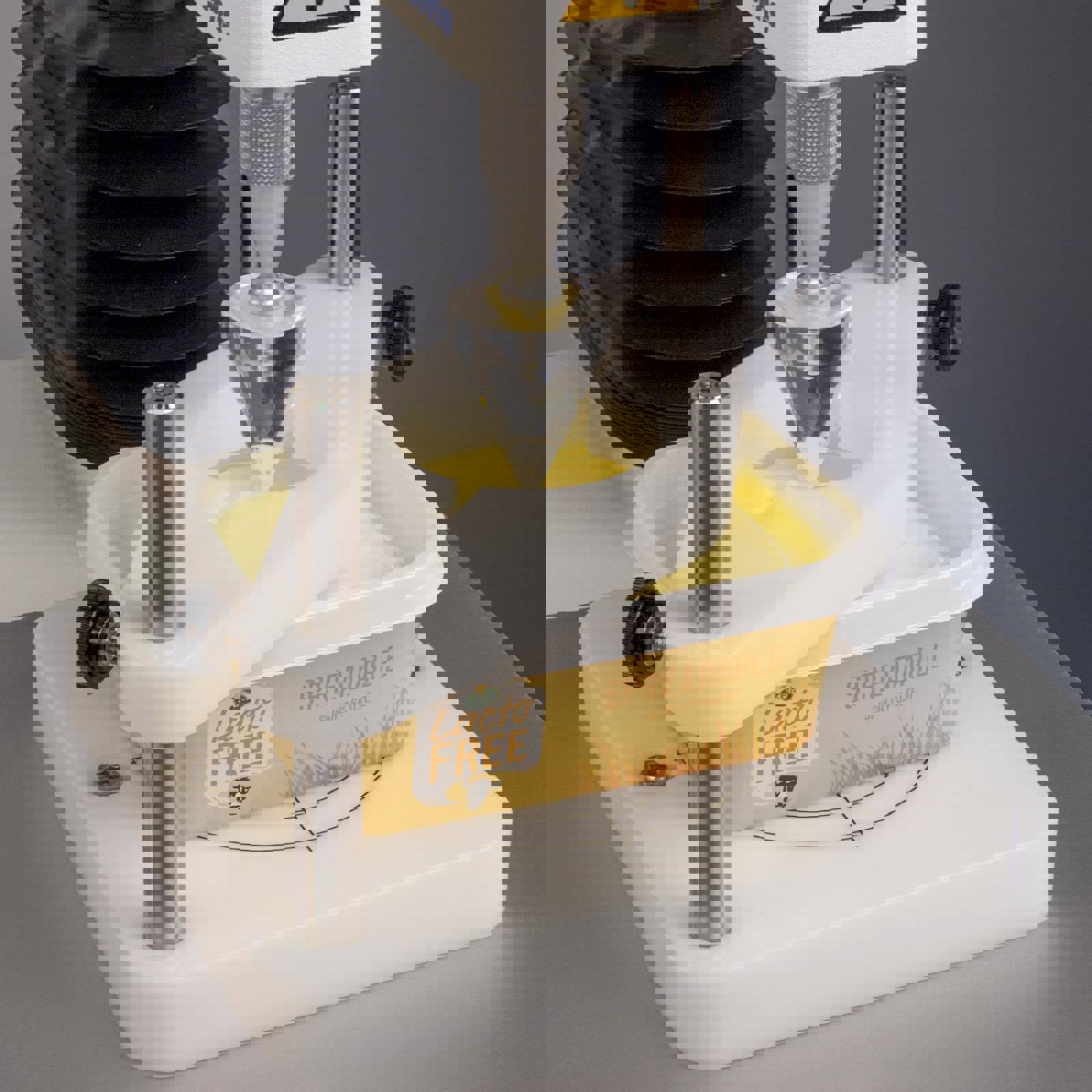 To assist with this problem we have a Universal Sample Clamp. This clamp is able to hold down a multitude of sample types, shapes and sizes, including the packaging which may contain the sample. The sample is placed on the base of the clamp. In the case of circular samples, the concentric rings will provided a means of central placing of the sample or its circular container. The top clamp can then be lowered down onto the sample and secured at a suitable clamping position using the post screws. A circular orifice provides suitable access for a probes/extrusion discs up to 50mm in diameter, whilst the linear hole running through this provides access for a standard blade. The clamp has been designed to sit diagonally on the base of the instrument to optimise the available space under the orifice for maximum sample size flexibility.