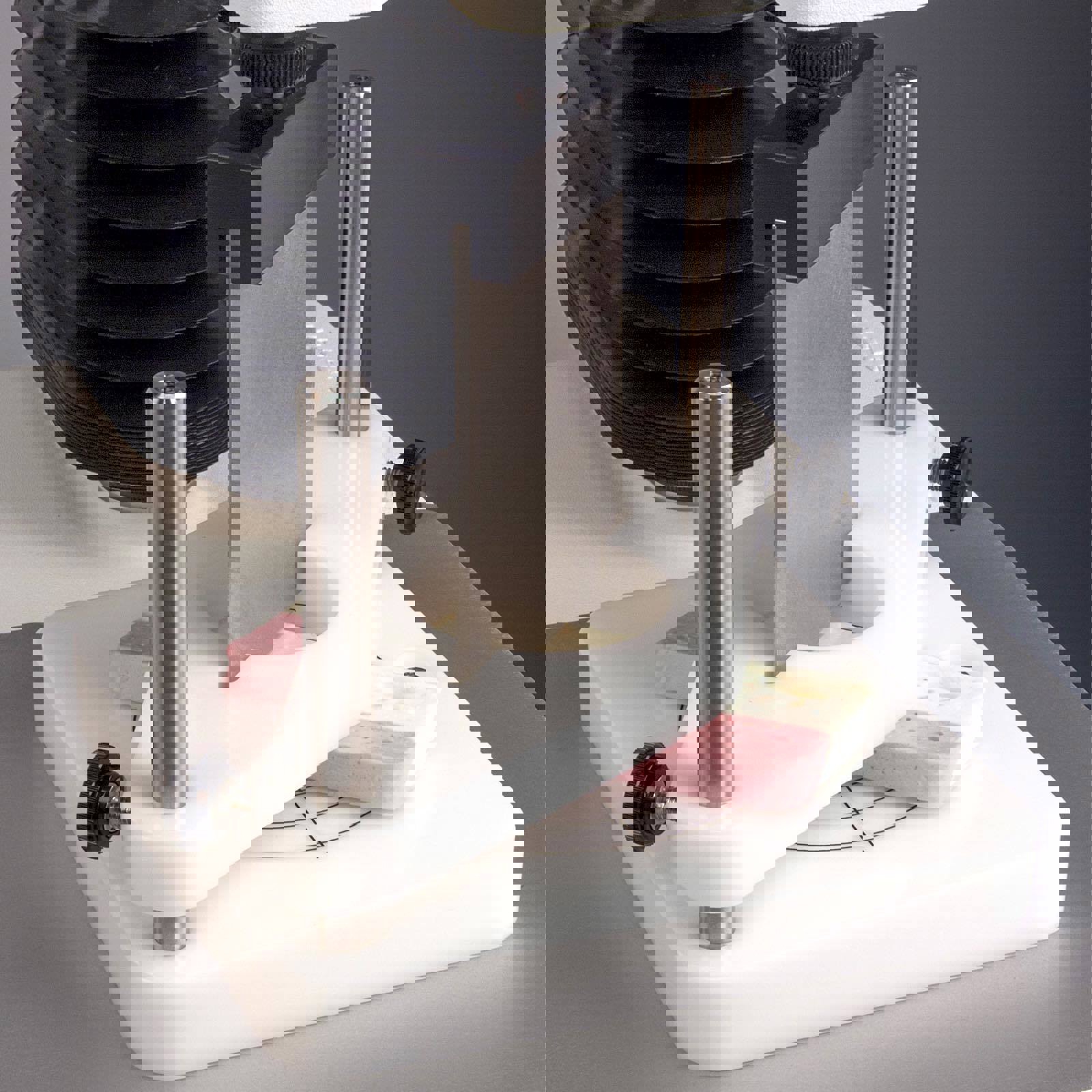 When penetrating, extruding or cutting a sample during a test it is common that the sample sometimes needs to be held down manually in order to avoid it being lifted up with the withdrawing probe or attachment. The penetration of a margarine sample, the cutting of a piece of meat or the backward extrusion of a thick moisturising cream are typical examples when this may occur. The resulting measured forces of this occurrence will be displaying the weight of the material (and/or its supporting packaging) being lifted rather than the forces necessary to withdraw from the sample. If lifting of the sample occurs the graph that is obtained will not therefore reflect the entire true textural profile of the sample.