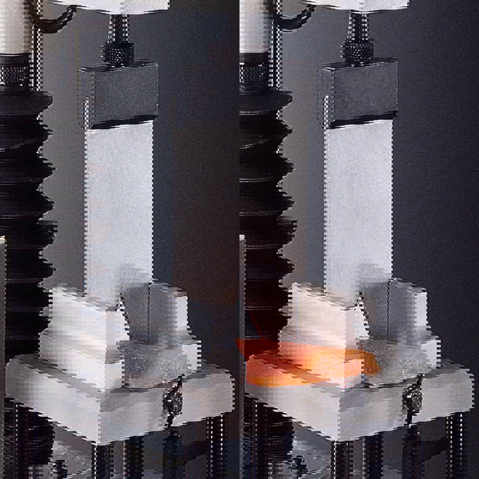 Consider the front teeth in a line – their action can be imitated by the use of a blade on the Texture Analyser. The ‘Bite force’ property can be assessed with a Standard Knife blade. This is the most common choice for a cutting test and consists of a Warner Bratzler Blade, a reversible blade, a slotted blade insert and a blade holder. The reversible blade has a knife edge at one end and a flat guillotine edge at the other. In operation, the blade is firmly held by means of the blade holder which screws directly into the Texture Analyser. The slotted blade insert is located directly into the Heavy Duty Platform and acts as a guide for the blade whilst providing support for the product.