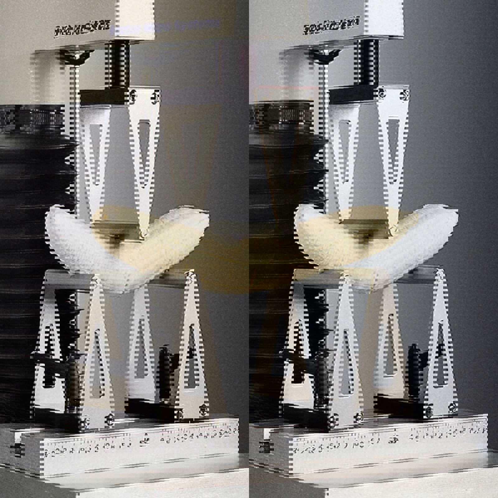 This large Three Point Bend Rig provides a base with graduated variable support length up to 240mm and accommodates samples up to 90 mm wide. A flexure unit is attached to the load cell. Rollers are provided on both supports and the flexure unit, to minimise friction during the test. Typical applications include measuring the break strength of biscuits, chocolate bars and packaging. A test may, for example, be used to assess the effect of different ingredients/processes used, or to examine typical finished product problems such as moisture uptake.