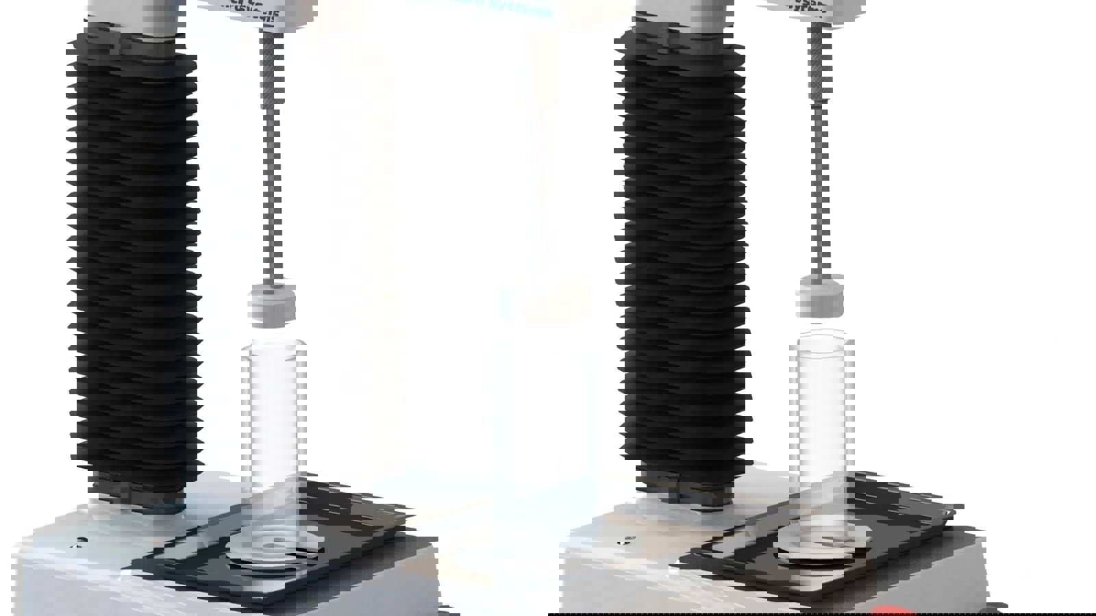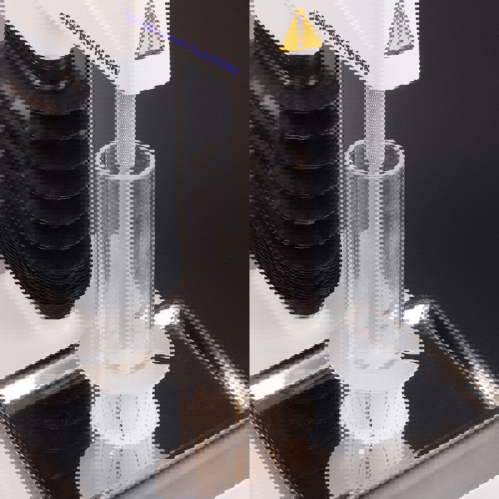 The Unconfined Yield Stress Rig is a textbook application for the simple measurement of powder flowability. The measurement is made by filling a chosen weight of powder sample into a tube and a compression piston then applies a chosen consolidation force for a specified time. After consolidation, the tube is slid upwards above the consolidation probe and held up via a support disc before the probe moves back down to compress the freestanding column of powder which ‘yields’.